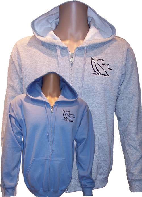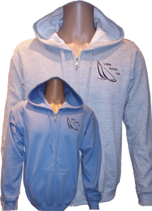 - Sailboat of Lake Anna VA – design and lettering in black or white depending on color of hoodie. Featured colors are Sports Gray and Carolina Blue.